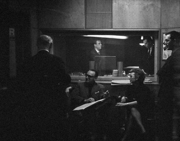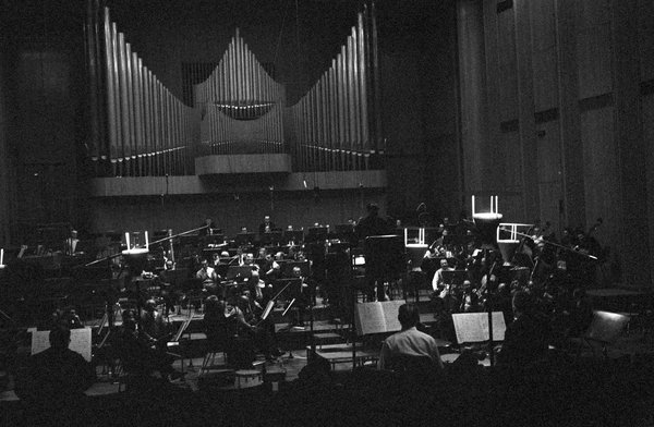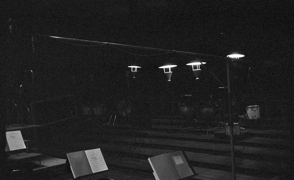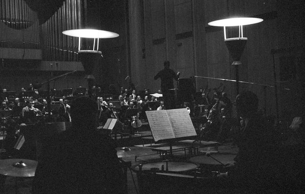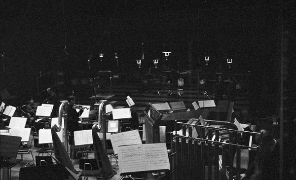 Die Tonaufnahmen fanden nur kurze Zeit nach der Uraufführung (15. Februar) am 21./22. Februar und am 2./3.März 1965 statt. Alle Fotos, die Zimmermann während dieser Tage aufnahm, sind sehr dunkel, was er mit großer Wahrscheinlichkeit nicht beabsichtigt hat. Trotz ihrer fast »nächtlichen« Schwärze hat diese Serie über den dokumentarischen Wert hinaus durchaus auch einen fotografischen Reiz, einen atmosphärischen ohnehin. Die komplette Serie umfasst 17 Fotos, von denen hier 15 gezeigt werden.