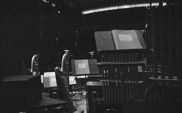 Details im leeren Sendesaal: Partituren auf Pulten, Lampen, Schlagwerk
