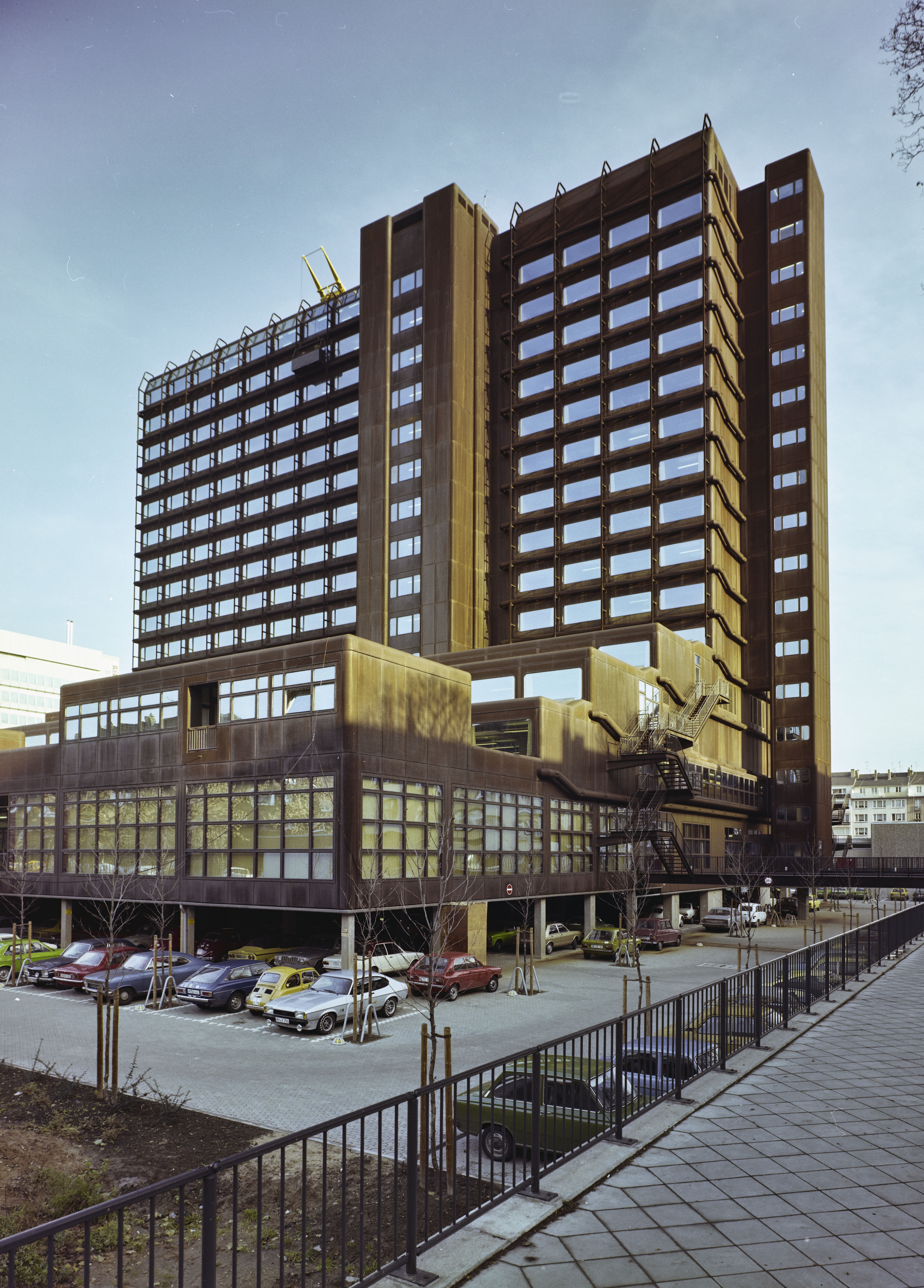 Etwa zur selben Zeit entwarf Böhm ein Gebäude für das nordrhein-westfälische Landesamt für Datenverarbeitung und Statistik in Düsseldorf (heute: Landesbetrieb Information und Technik des Landes Nordrhein-Westfalen), dessen beeindruckende Dimensionen als urbanes Statement zu bezeichnen sind. Wie eine riesige Wandscheibe erhebt sich ein mit rostansetzenden Platten aus Cortenstahl verkleideter, zwölfgeschossiger Bürobau über einer annähernd quadratischen, sechsgeschossigen und auf den Längsseiten dreifach gestuften Basis. Das monolithische Konstrukt weist trotz seines futuristisch anmutenden, stellenweise groben Formats an vielen Stellen Binnenstrukturen auf, über die es auf einzelnen Ebenen erfahrbar wird. Die vier Zugänge sind als Brücken über das tiefergelegte Parkplatzniveau rings um den Bau angelegt und verleihen ihm damit die Anmutung einer modernen Trutzburg. Der fotografische Blick auf den westlichen Eingang analysiert regelrecht die Struktur aus verschiedenen Nutzungsbereichen sowie den technisch-konstruktiven Anspruch der eigenwilligen Gebäudeästhetik und lenkt die Wahrnehmung vom Großbau auf die innovativen Details.
