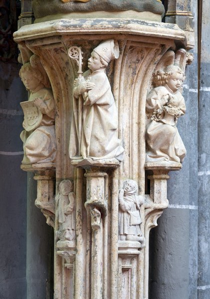 Steinerne Korneliusfigur im Chor, Konsole mit Bischof und Engeln nach der Restaurierung 2012
