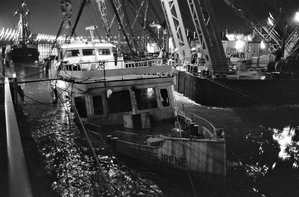 Mit riesigen Schiffskränen wird die „Prinses Irene“ angehoben. Im Vordergrund